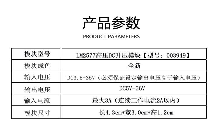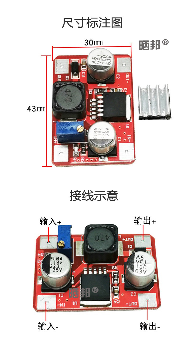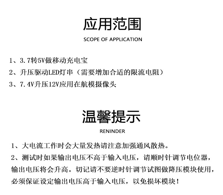 注意:此模塊最大功率20W.當您測試時如果輸出電壓不高於輸入電壓,請順時針調節電位器,輸出電壓將會升高。切記請不要逆時針調節試圖做降壓模塊使用,必須保證設定輸出電壓高於輸入電壓,以免損壞模塊!