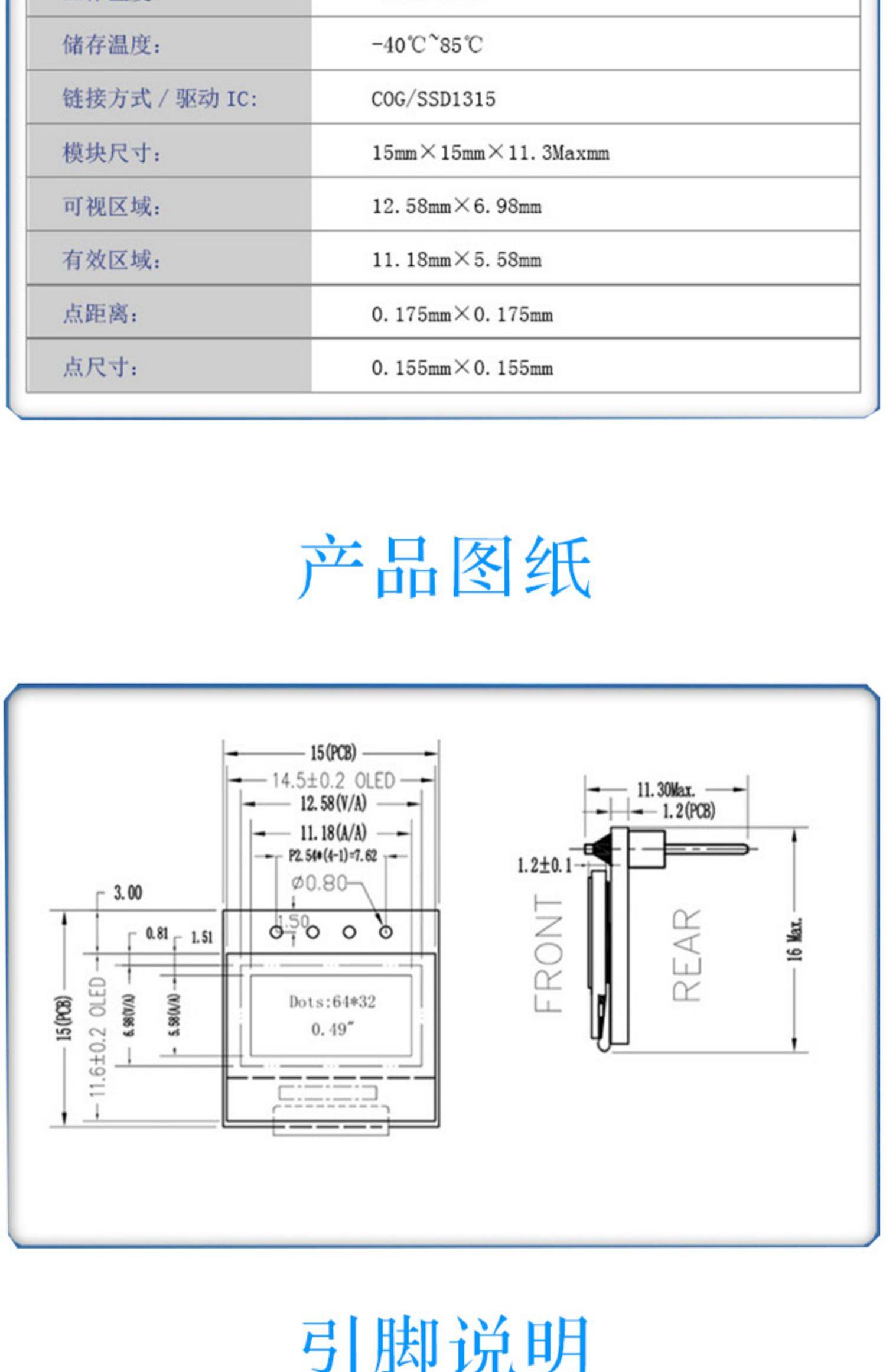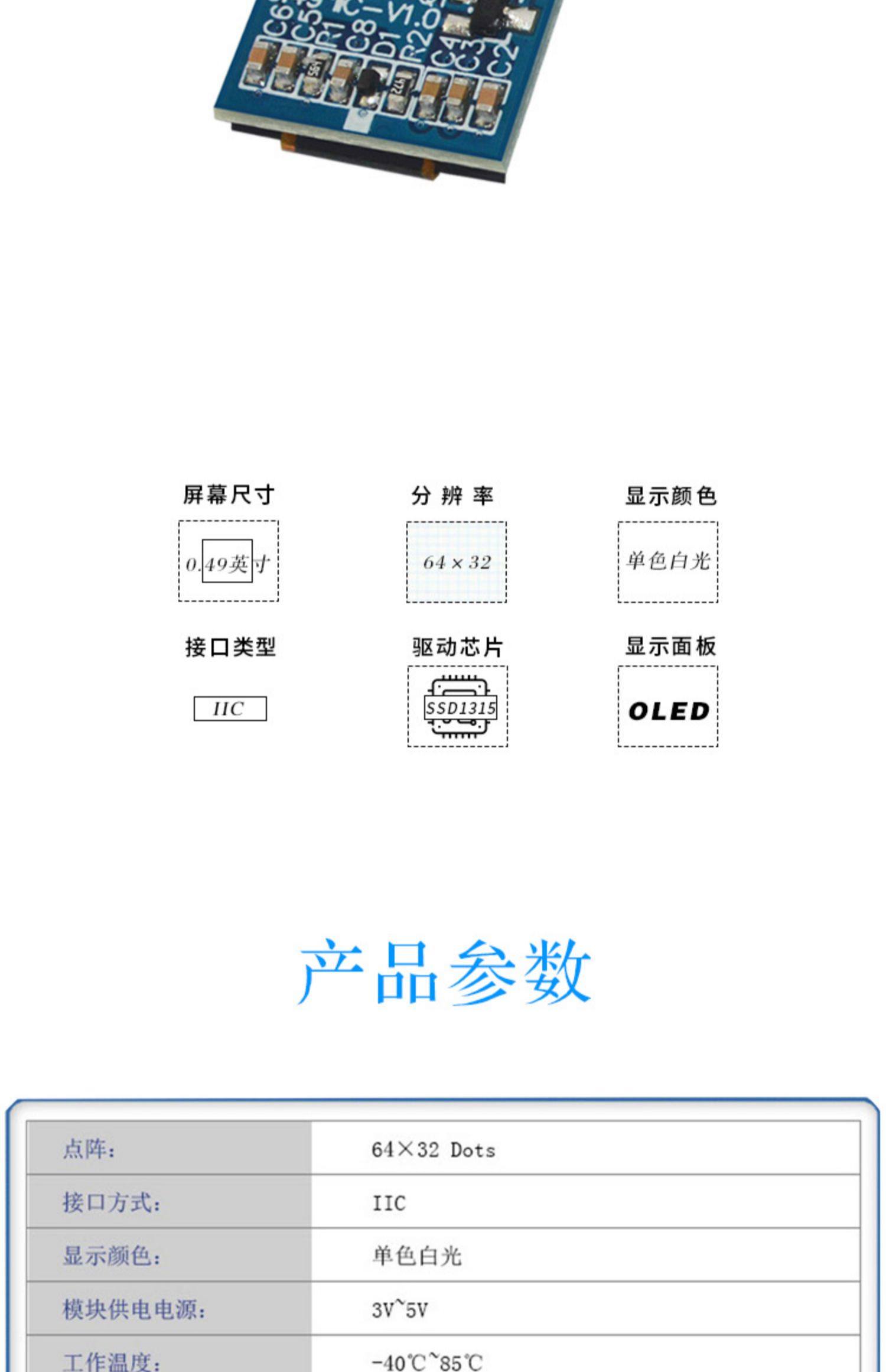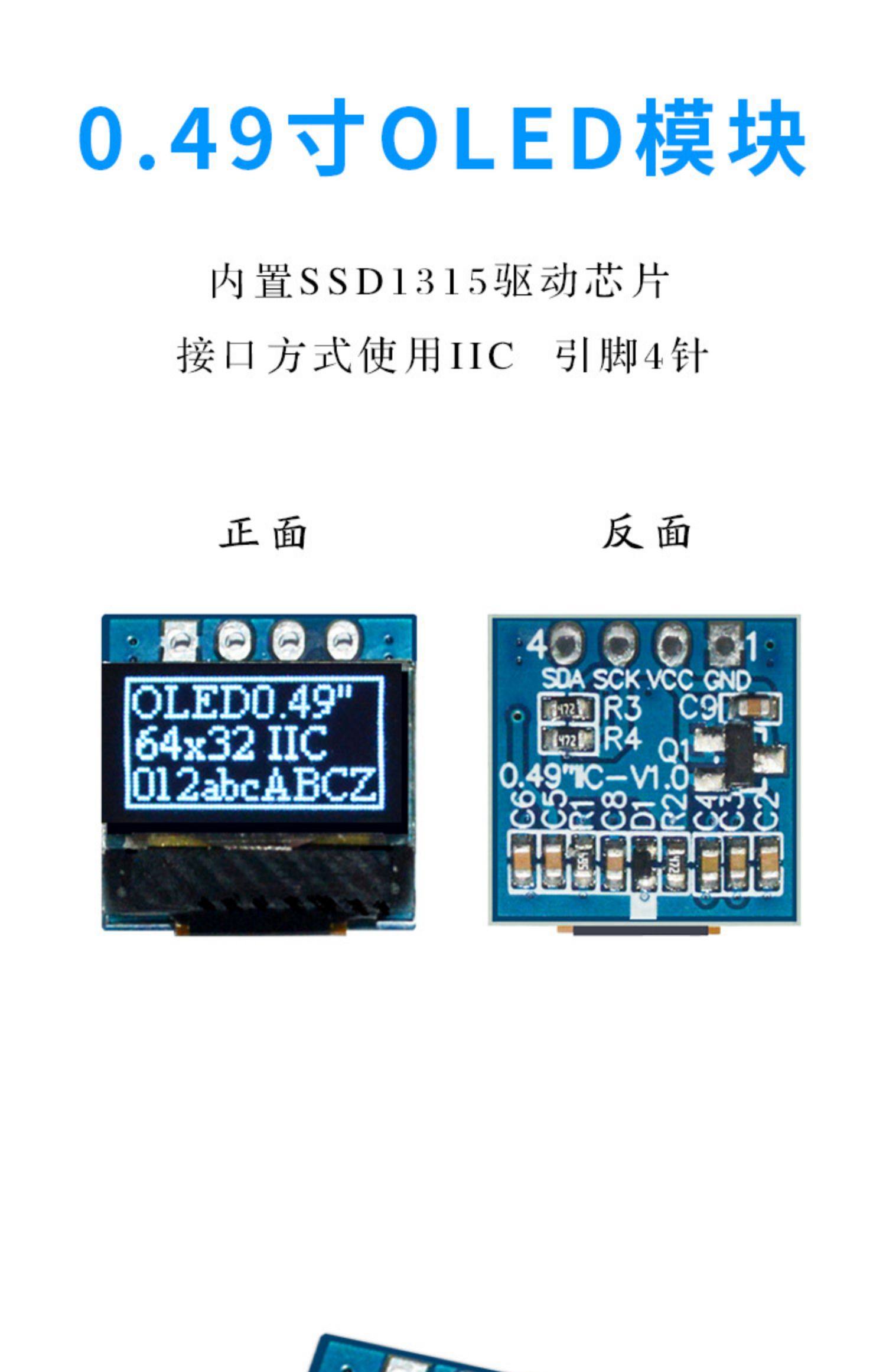 0.49吋(4Pin)白光 OLED 液晶顯示器 4針模組 64x32 串列埠 IIC 驅動SSD1315(未焊排針)