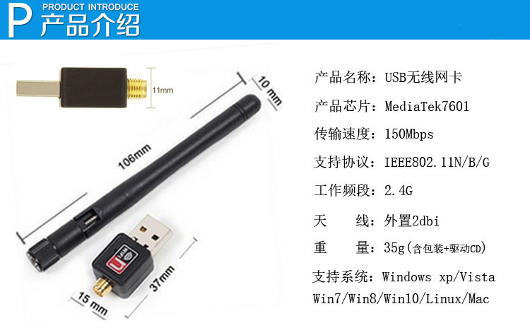 150M無線USB網卡符合IEEE 802.11n(Draft 2.0)、IEEE 802.11g、IEEE 802.11b標準,無線傳輸速率高達150Mbps。【(內-外)置智能天線】,提供更好的無線傳輸性能、穩定性和無線覆蓋範圍。同時採用CCA技術,能自動避開頻道干擾並充分利用頻道捆綁優勢。該產品支持64/128/152位WEP加密,以及WPA/WPA2、WPA-PSK/WPA2-PSK等高級加密與安全機制,同時具有QSS快速安全設置功能,符合WPS,能夠輕鬆設置無線安全。此外,該產品具有優先級服務功能,確保視頻、語音等帶寬敏感數據的優先處理。該產品與11g產品及其它11n產品也能夠很好地兼容。
