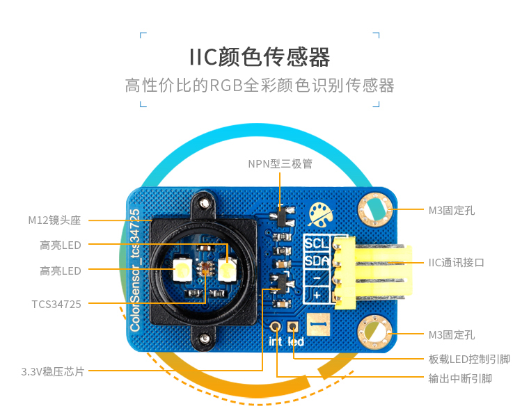 為了提高精度,防止周邊環境干擾,我們在傳感器上添加了一個鏡頭罩,有效減少外界雜光干擾傳感器,讓顏色管理更加準確。板載自帶2個高亮LED,可以讓傳感器在低環境光的情況下依然能夠正常使用,實現“補光”的功能。模塊採用I2C通信,擁有4P防插反接口,更加便利。