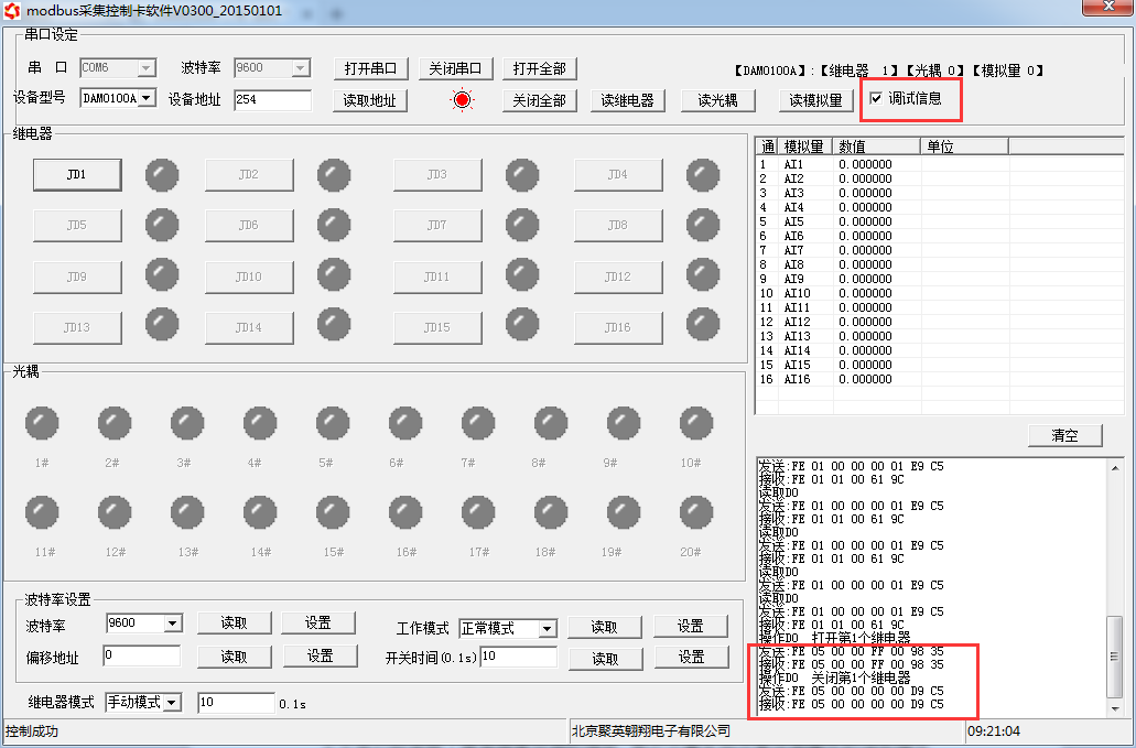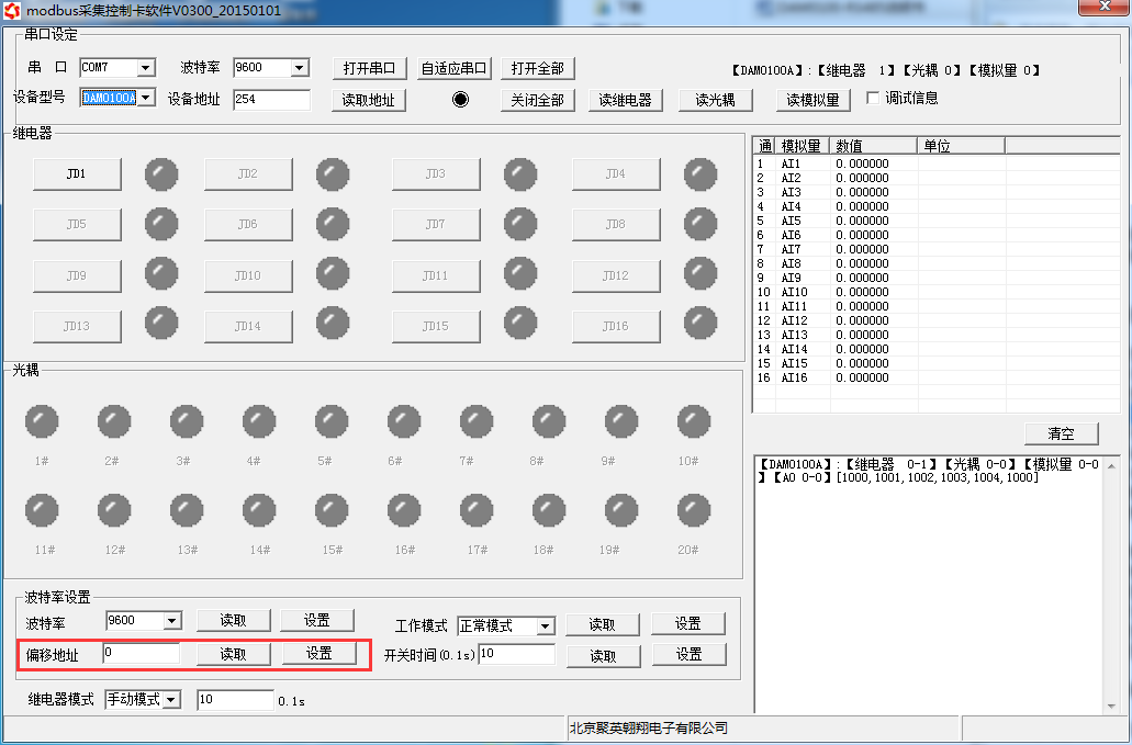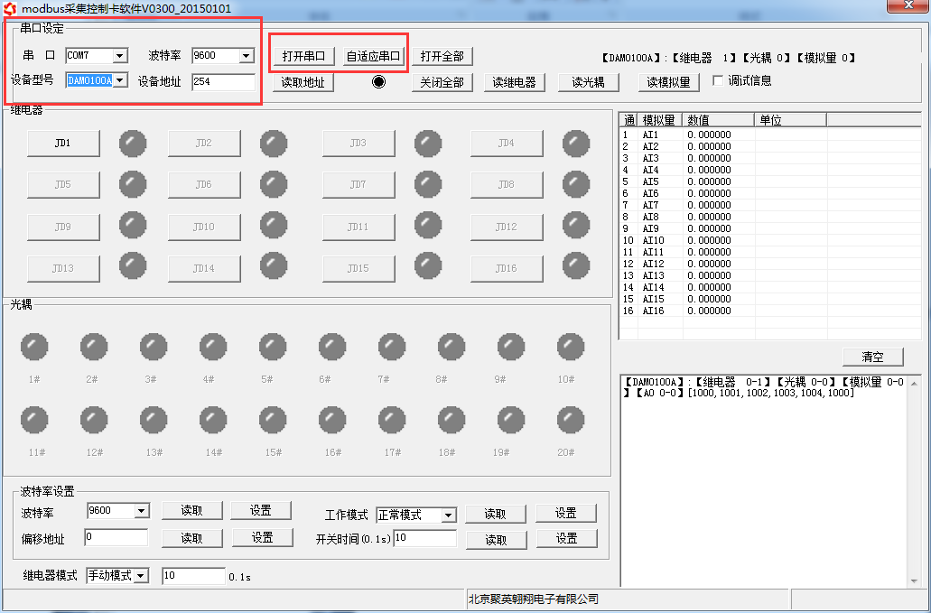 打開“聚英翱翔DAM系列配置軟件”;串口設定欄:串口選擇您電腦對應COM口,波特率選擇設備默認波特率(9600)(未自己設置過波特率前),設備地址填寫“254”(254為設備的廣播地址),設備型號選擇相對應型號,設置好以上設備的4個參數後點擊打開串口,點擊繼電器按鈕“ JD1 ”若繼電器反應則連接成功。