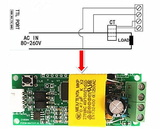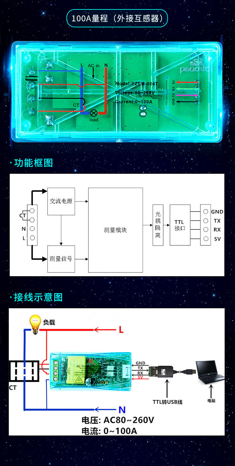 PZEM-004T 不帶殼,裸板(100A +閉合式CT+TTL轉USB線)交流電壓