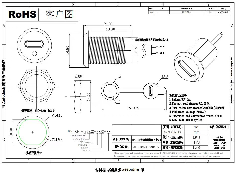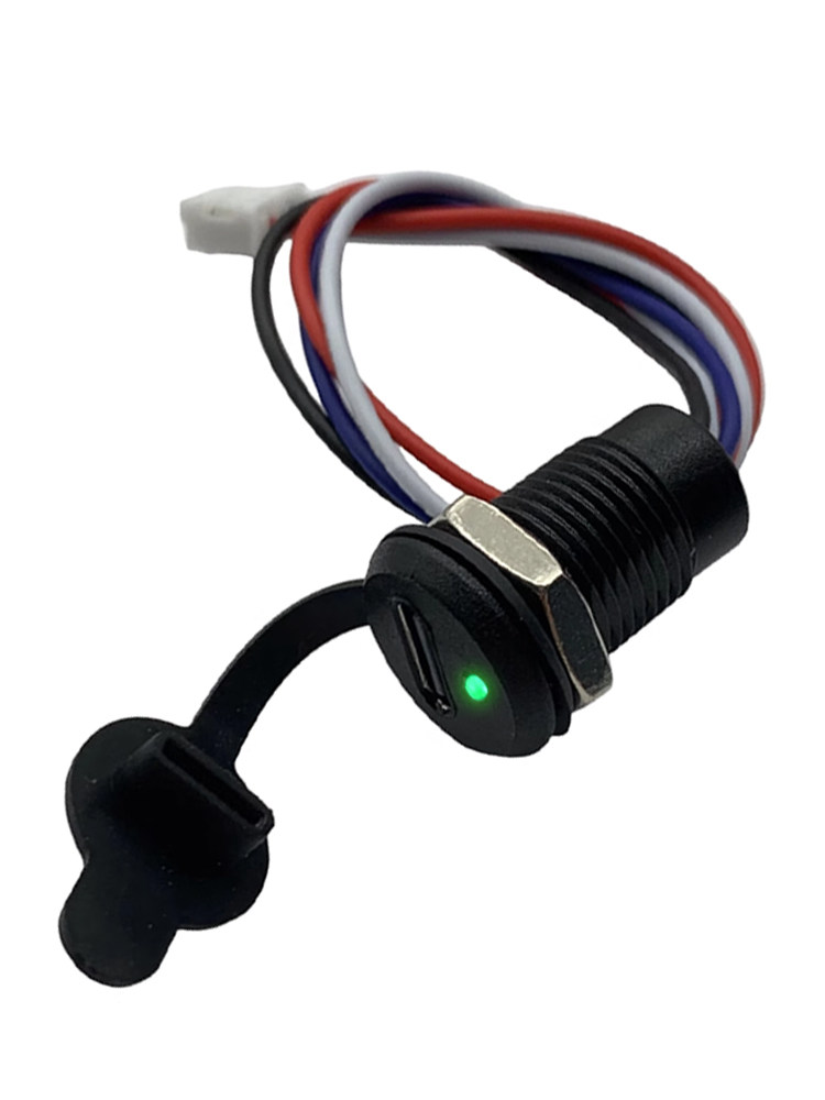 USB Type-C 4芯PH2.0【螺牙-帶燈】防水母座 帶數據充電 母頭 DIY 帶線插座