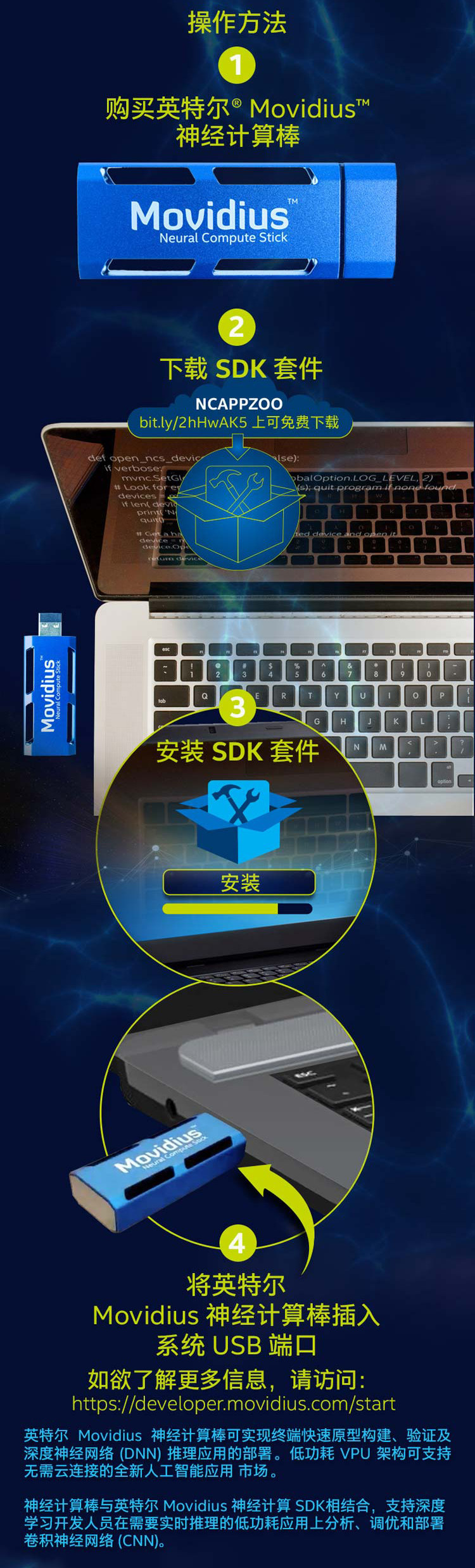 通過主機上的單個USB 3.0端口提供的所有數據和電源無需雲連接的實時設備推斷快速部署現有CNN模型或經過專門培訓的網絡,支持多個神經元計算棒可以通過合適的集線器連接到主機PC。