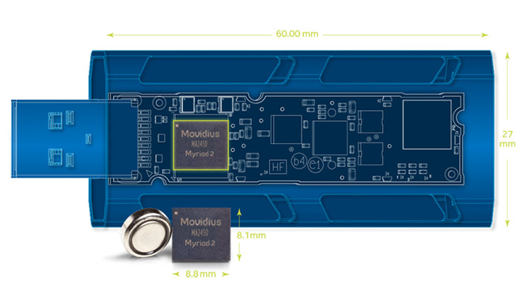 - • Movidius 600MHz Myriad-2 SoC with 12 x 128-bit VLIW SHAVE vector processors