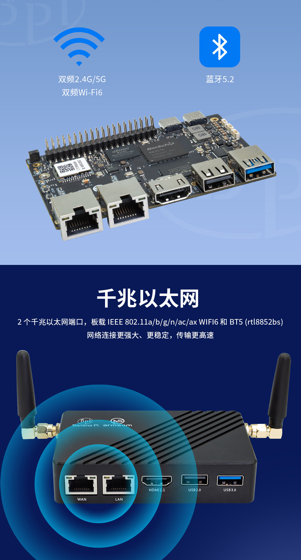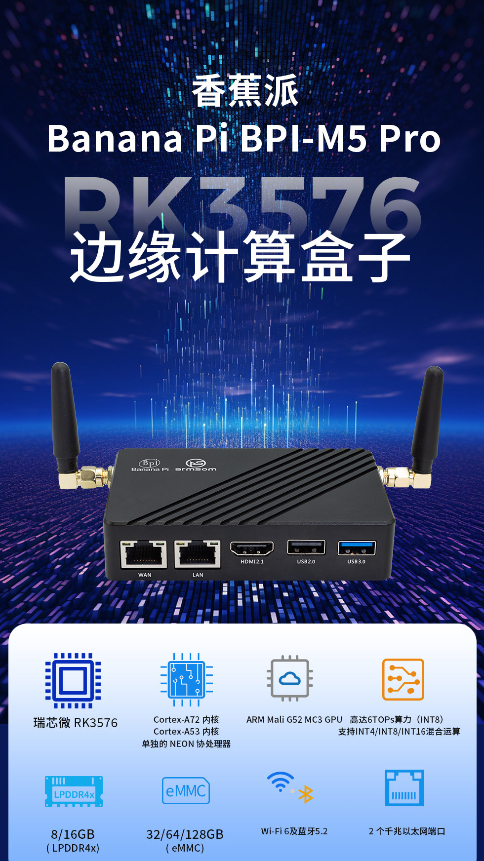 香蕉派 Banana Pi M5 Pro (BPI-M5 Pro) 開發板(帶外殼,顏色隨機)8G RAM+64G eMMc,RK3576邊緣運算盒子、NAS多功能網關