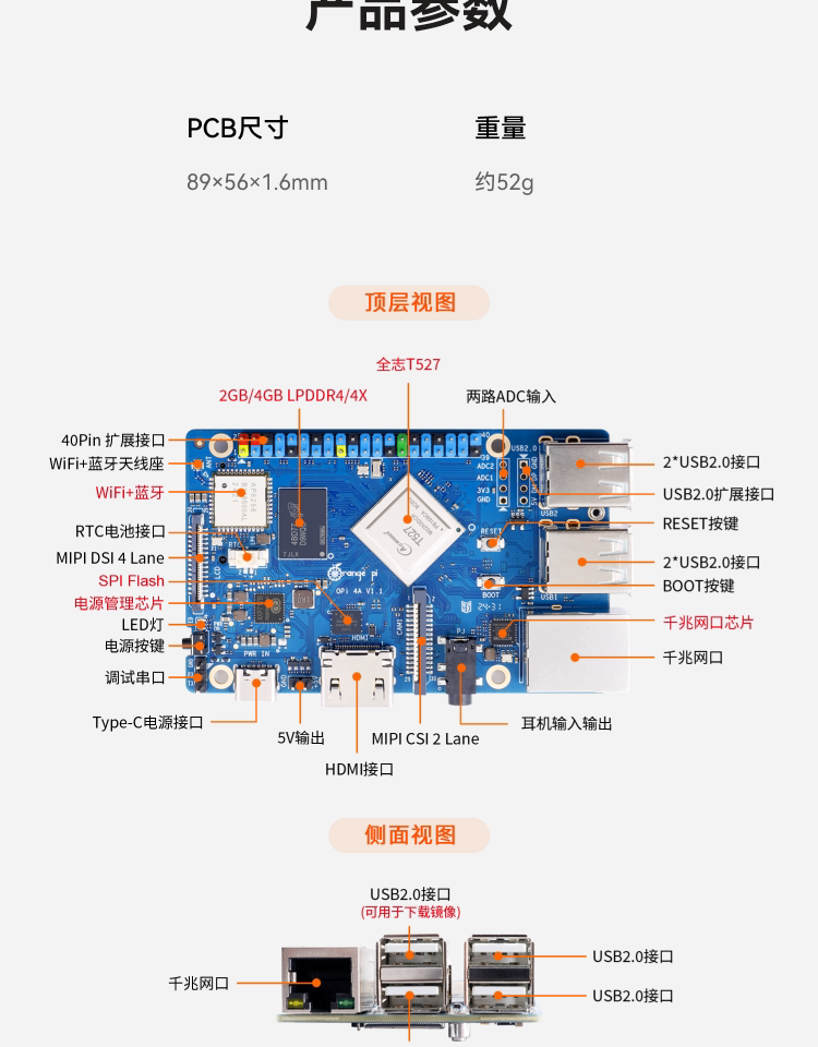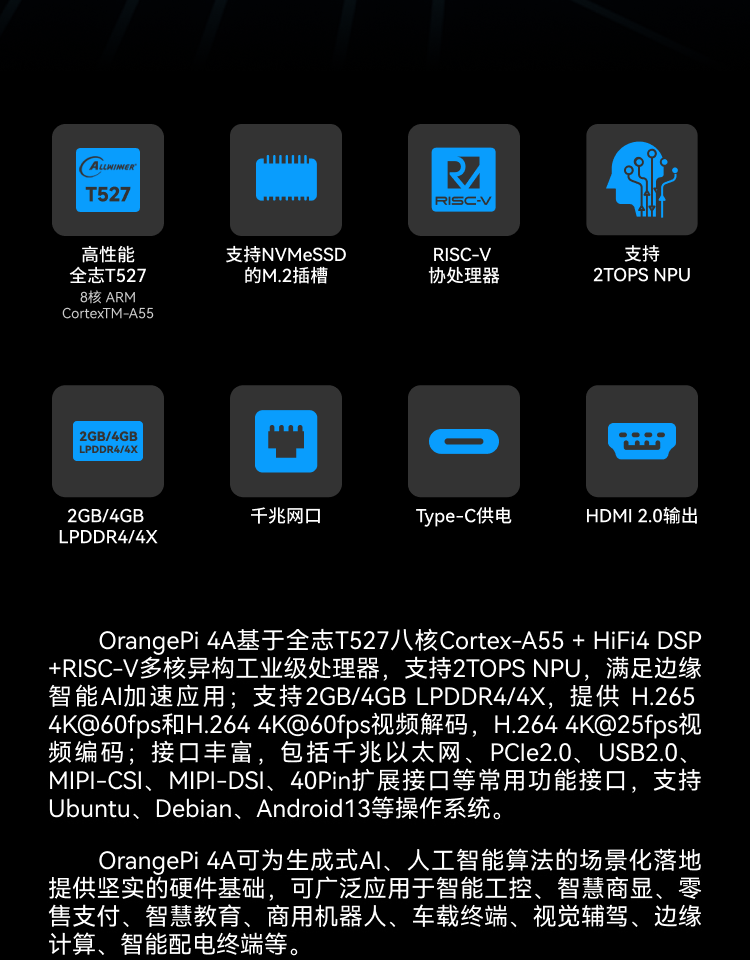 $香橙派 OrangePi 4A 2G(單板)全志T527晶片 八核A55